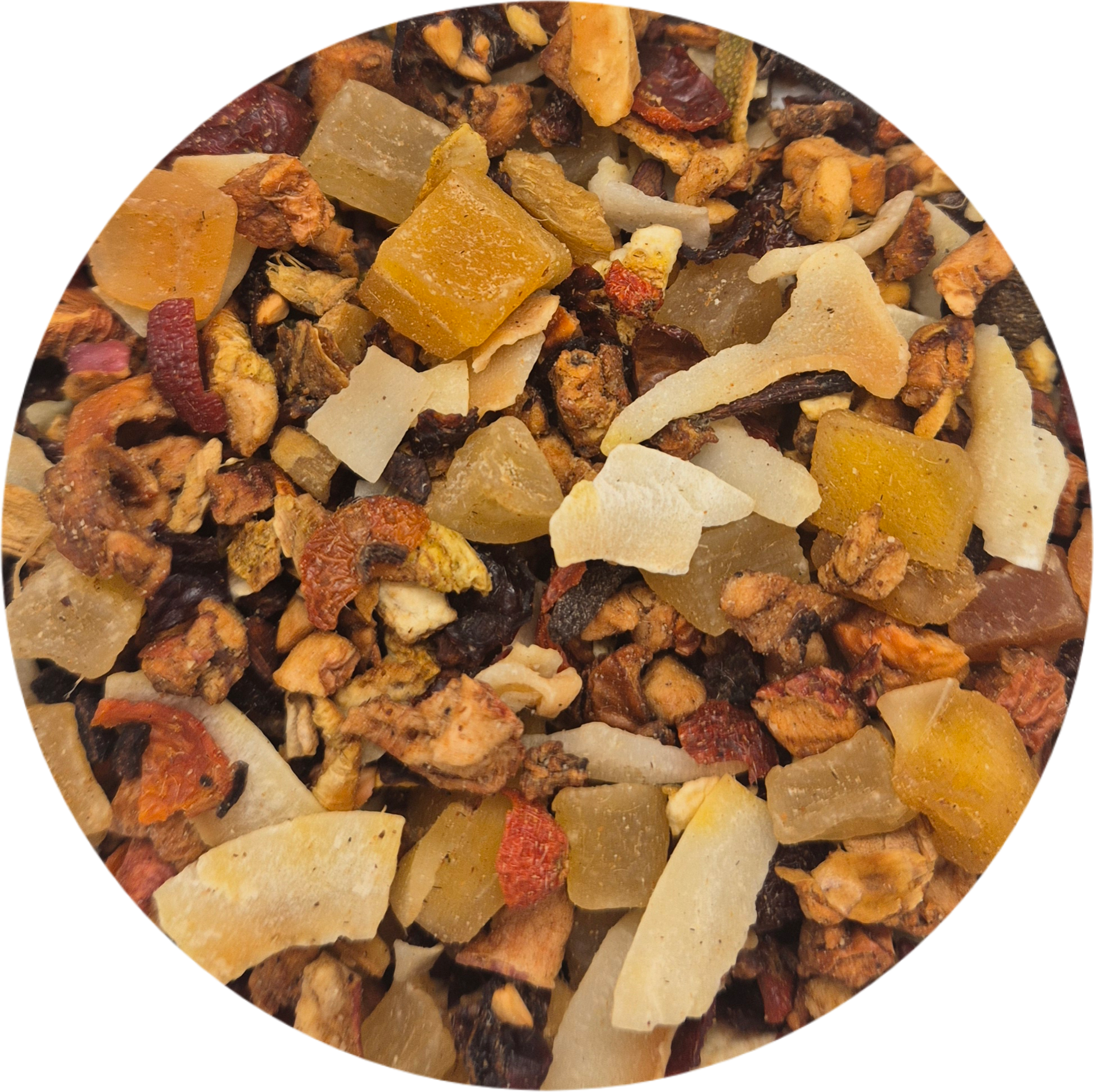 Ingrédients : Pomme, ananas (ananas, sucre), coco (coco, graisse de coco, sucre), cynorrhodon, mangue (mangue, sucre), bâtons de cannelle, papaye (papaye, sucre), gingembre, écorces de mandarine, arôme naturel d'orange, morceaux d'orange, clou de girofle.